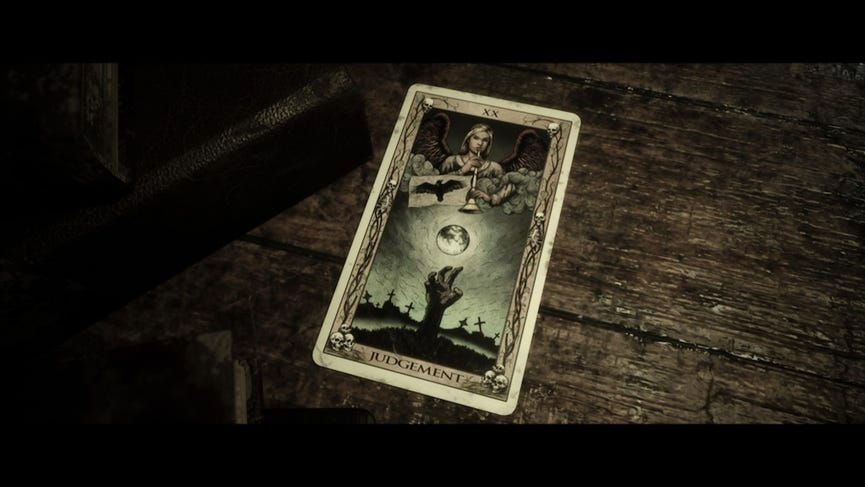 游戏也试图搞点创新,引入了塔罗牌机制,其实就是在游戏过程中,操纵角色在场景自由探索时会发现塔罗牌,一个章节中可能会发现多张,而在章节结尾吉卜赛人老婆婆则会帮你解读其的内涵,但只让你选择其一,用来预测未来,观测到可能发生的场景。但实际游玩下来纯鸡肋。