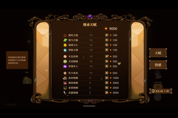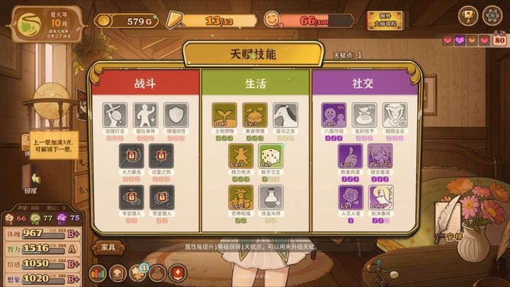 前中期由于金钱的紧缺,行动点便显得额外重要,玩家需要谨慎规划实现最大化利用。不过得益于游戏的天赋系统,玩家每提升一次属性便可获得一点天赋点,可通过消耗点数提升3点行动点上限,推荐玩家首选喽!当然,根据你想要达成的结局可以有选择地分配天赋点,或将其用于日常生活,实现肥料永动;或用于消除魔物的战斗,提高基础属性。