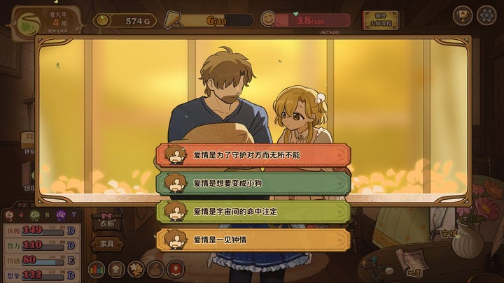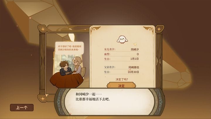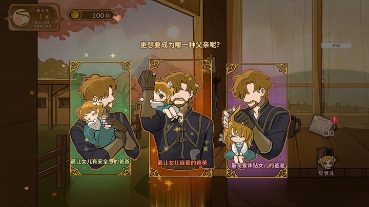 游戏初始便抛出了经典性问题——你更想要成为哪种父亲呢?由此问题,我原以为父亲(即玩家视角)在游戏中的分量极重,但实际体验下来却寥寥无几,只有在前六回合的童年时代经常亮相,其余时间则更像一个观测者——记录、指导着女儿的成长。你也可以选择成为很逊的父亲。拜托,爸爸你超逊的(