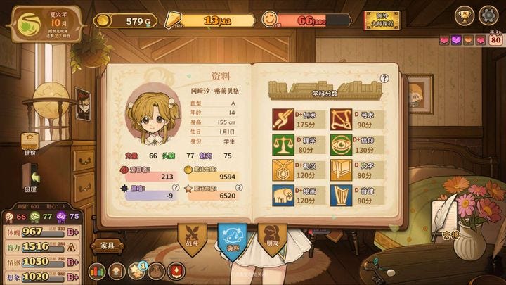 虽然游戏大体看来与中国式家长、美少女梦工厂神似,但由于其「剑与魔法」的中世纪世界观以及魔族首领“鸮姬”,观感上可能会带来更加独特的体验。女儿不仅要学习理学文学等传统知识,也要德智体美劳全方面发展,绘画音律自然不能落下,甚至还要学习剑术、弓术勇闯魔穴。此外,在地图的各个角落也分散着骰子决斗、赛马等小游戏,恰到好处的小游戏很好地减弱玩家阅读文字的重复枯燥感。